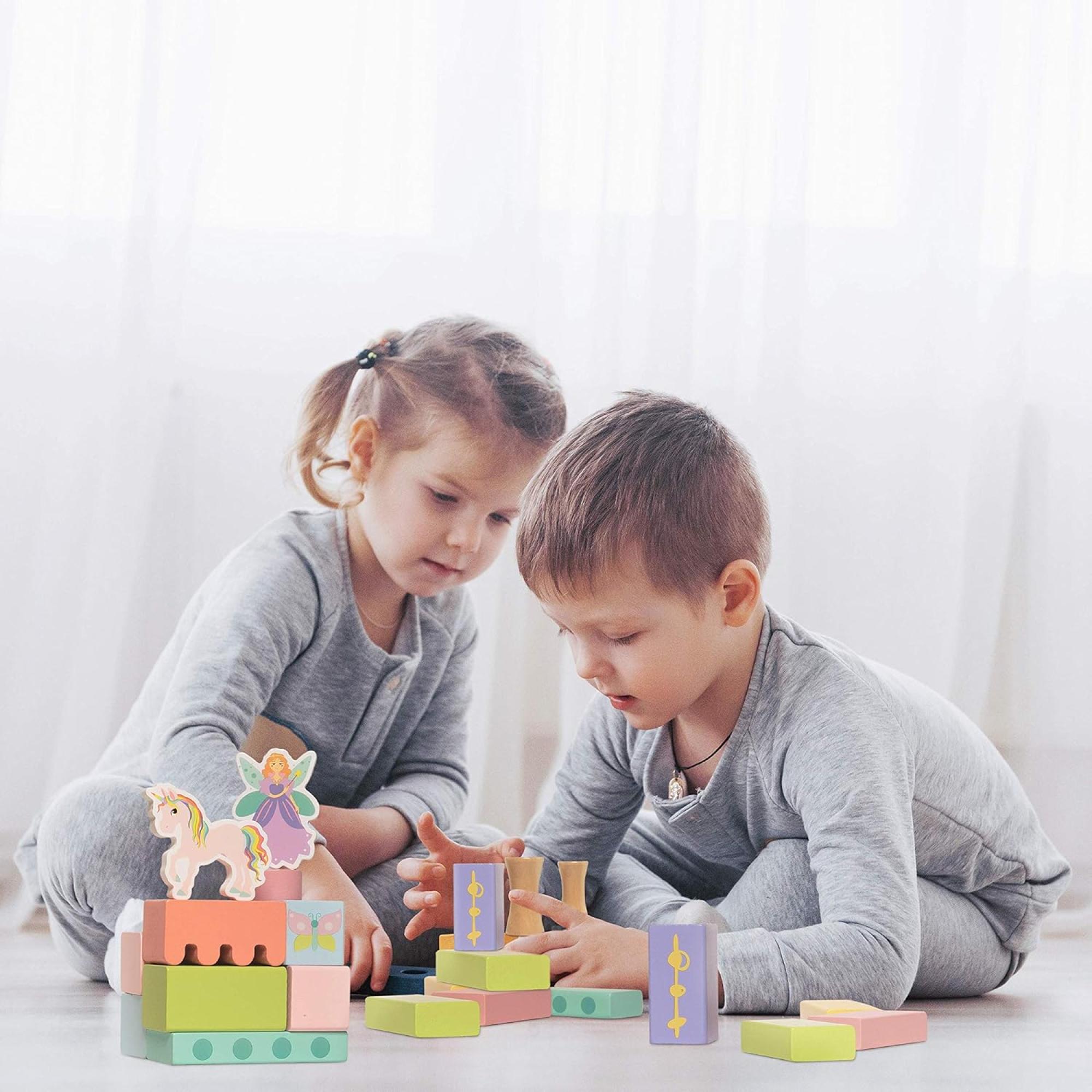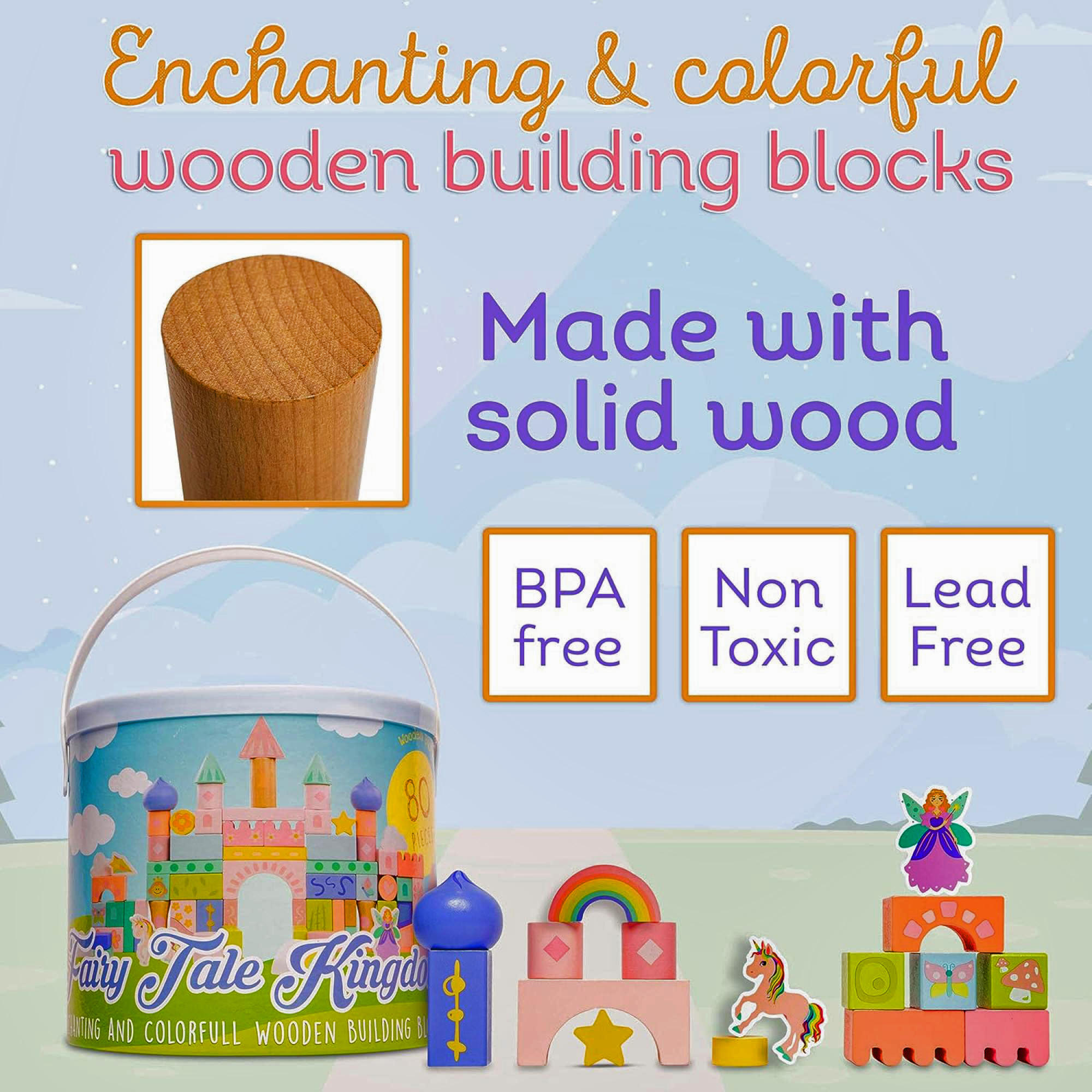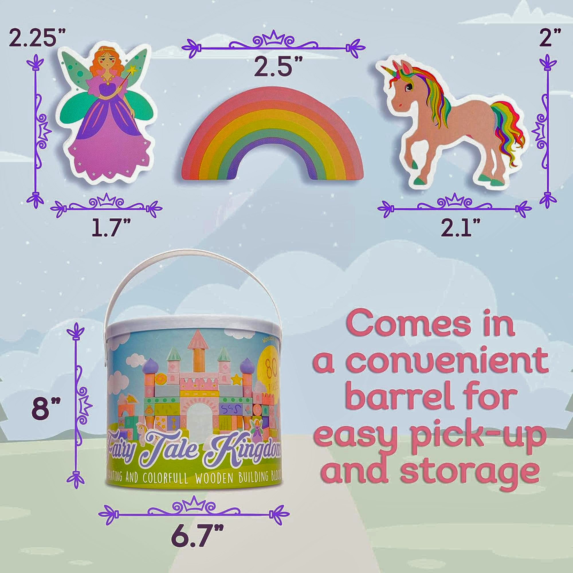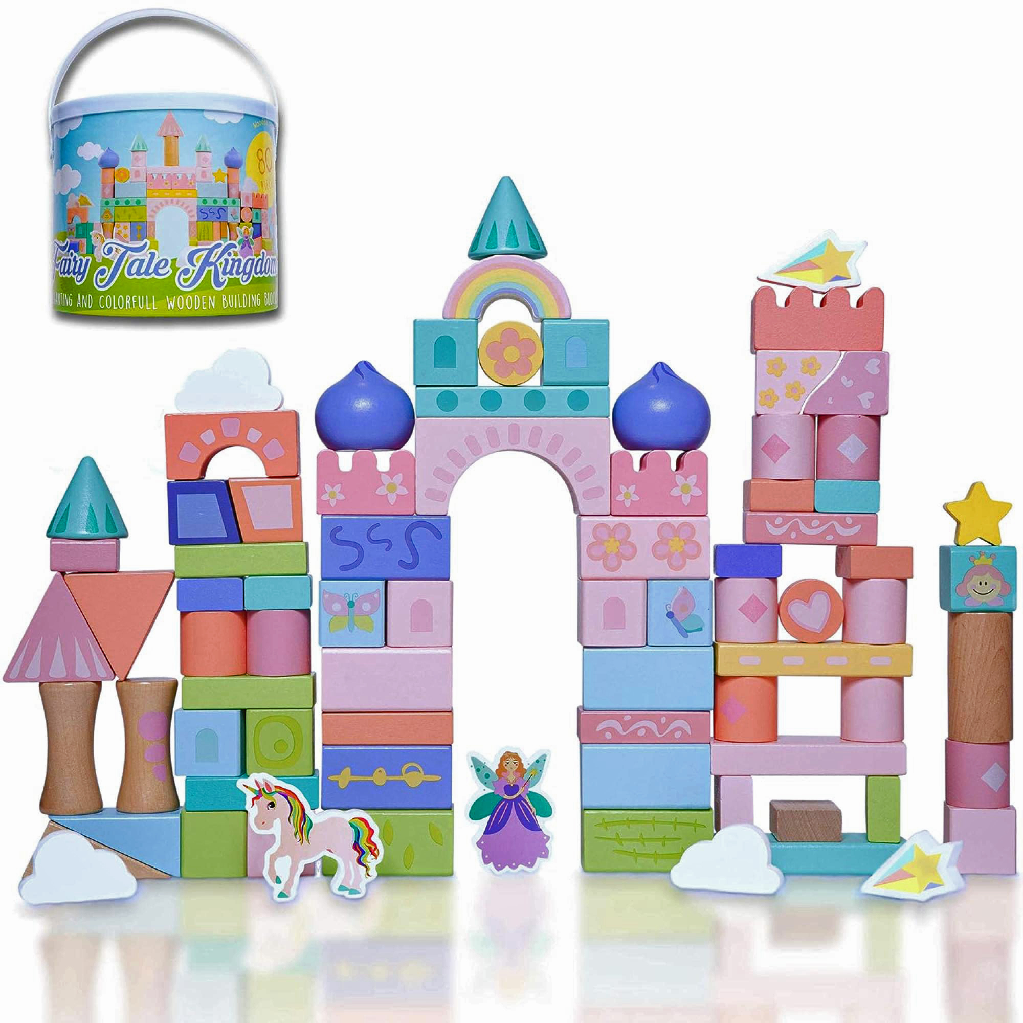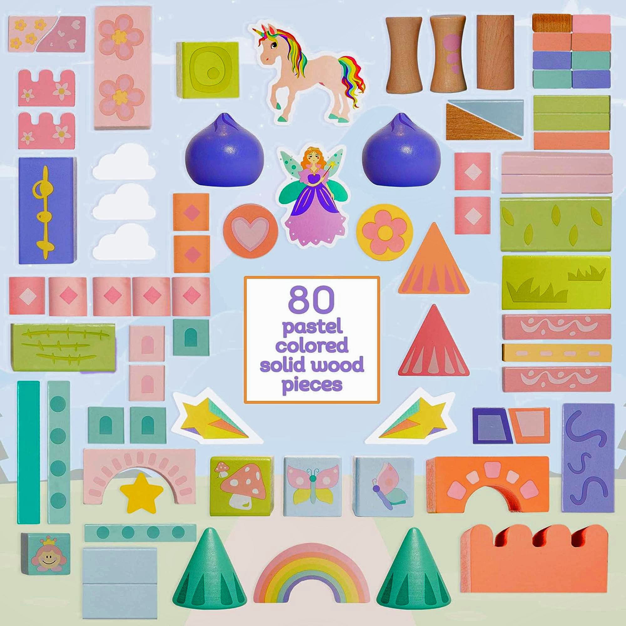 80-Piece Fairytale Building Set: Includes pastel castle blocks, unicorn figures, rainbows, clouds, stars, arches, and shapes for open-ended magical construction play.