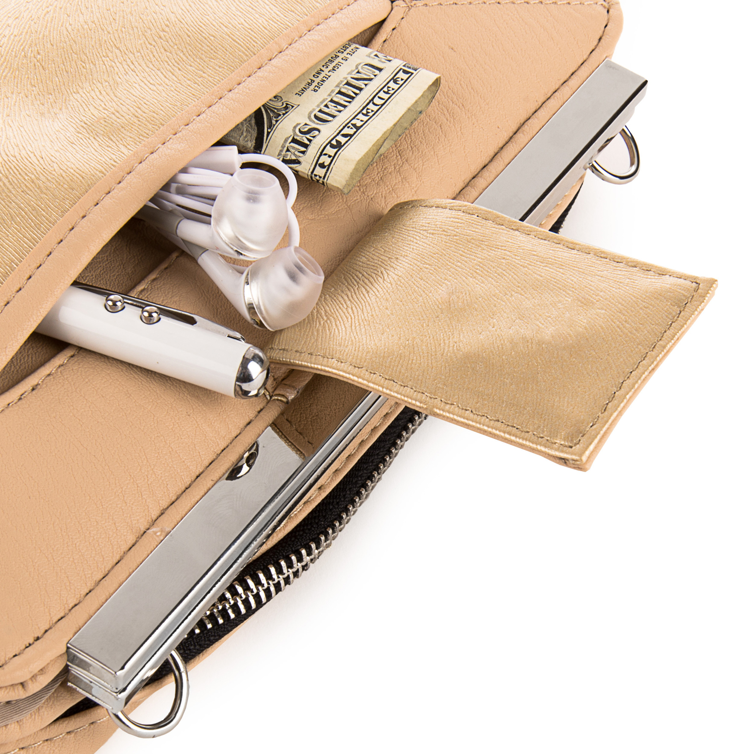 Inverted pleat pocket fit for smaller items such as receipts.